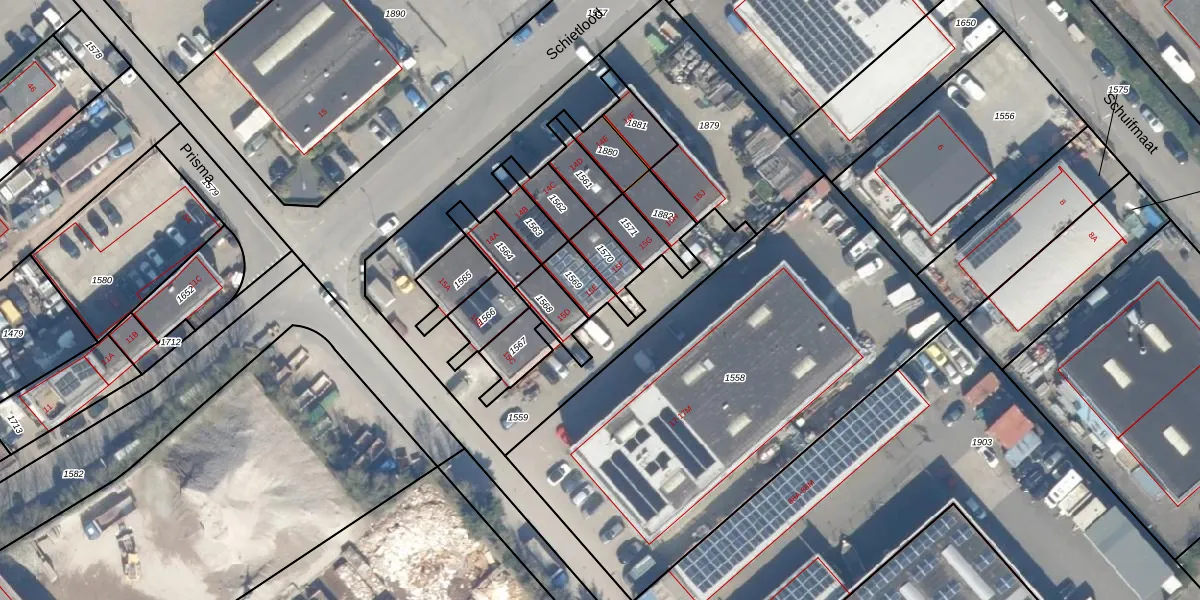 Het perceel waarop Prisma 15-E staat heeft een oppervlakte van 82 m². Dit is een klein perceel. De perceeloppervlakte wordt geregistreerd door het Kadaster. Gedetailleerde informatie over de maten van dit perceel kunt u vinden in het rapport Kadastrale kaart met maatvoering van Prisma 15-E.