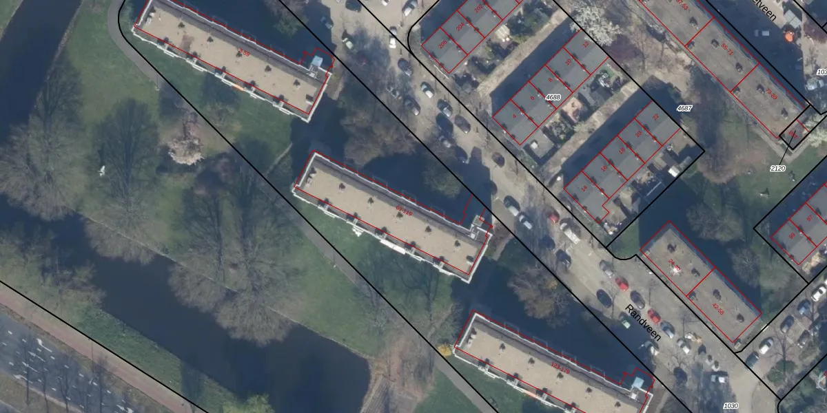 Het perceel waarop Randveen 101 staat heeft een oppervlakte van 9564 m². Dit is een zeer groot perceel. De perceeloppervlakte wordt geregistreerd door het Kadaster. Gedetailleerde informatie over de maten van dit perceel kunt u vinden in het rapport Kadastrale kaart met maatvoering van Randveen 101.