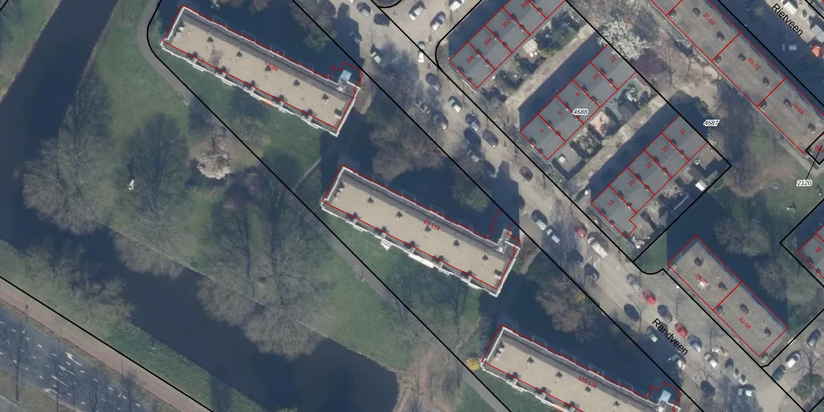 Het perceel waarop Randveen 103 staat heeft een oppervlakte van 9564 m². Dit is een zeer groot perceel. De perceeloppervlakte wordt geregistreerd door het Kadaster. Gedetailleerde informatie over de maten van dit perceel kunt u vinden in het rapport Kadastrale kaart met maatvoering van Randveen 103.