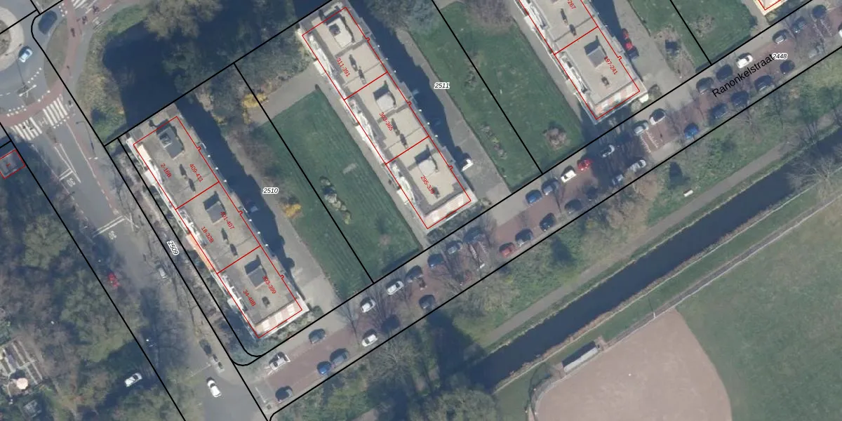Het perceel waarop Ranonkelstraat 325 staat heeft een oppervlakte van 2963 m². Dit is een zeer groot perceel. De perceeloppervlakte wordt geregistreerd door het Kadaster. Gedetailleerde informatie over de maten van dit perceel kunt u vinden in het rapport Kadastrale kaart met maatvoering van Ranonkelstraat 325.