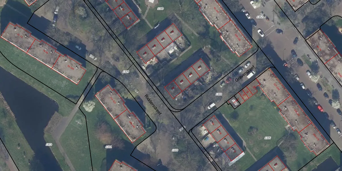 Het perceel waarop Riddersdreef 36 staat heeft een oppervlakte van 5335 m². Dit is een zeer groot perceel. De perceeloppervlakte wordt geregistreerd door het Kadaster. Gedetailleerde informatie over de maten van dit perceel kunt u vinden in het rapport Kadastrale kaart met maatvoering van Riddersdreef 36.