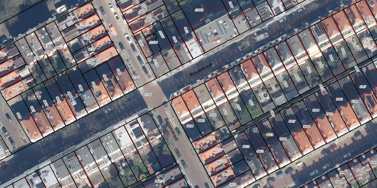 Het perceel waarop Riouwstraat 151 staat heeft een oppervlakte van 175 m². Dit is een middelgroot perceel. De perceeloppervlakte wordt geregistreerd door het Kadaster. Gedetailleerde informatie over de maten van dit perceel kunt u vinden in het rapport Kadastrale kaart met maatvoering van Riouwstraat 151.