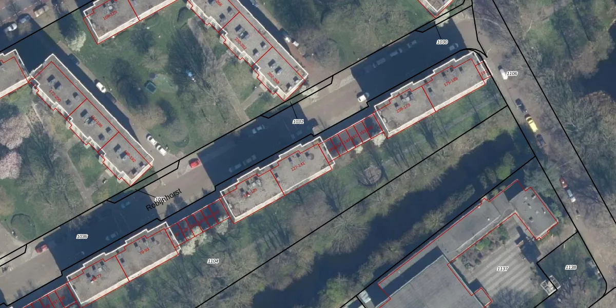 Het perceel waarop Robijnhorst 141 staat heeft een oppervlakte van 6423 m². Dit is een zeer groot perceel. De perceeloppervlakte wordt geregistreerd door het Kadaster. Gedetailleerde informatie over de maten van dit perceel kunt u vinden in het rapport Kadastrale kaart met maatvoering van Robijnhorst 141.