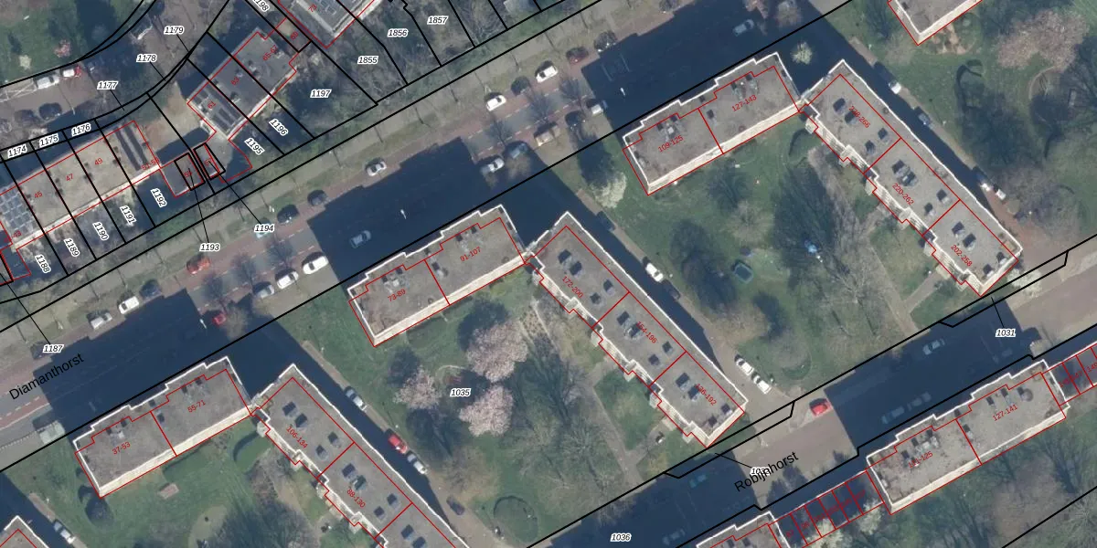 Het perceel waarop Robijnhorst 186 staat heeft een oppervlakte van 1,7 ha. Dit is een zeer groot perceel. De perceeloppervlakte wordt geregistreerd door het Kadaster. Gedetailleerde informatie over de maten van dit perceel kunt u vinden in het rapport Kadastrale kaart met maatvoering van Robijnhorst 186.