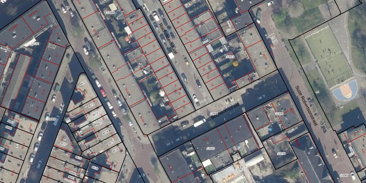 Het perceel waarop Rochussenstraat 43 staat heeft een oppervlakte van 2963 m². Dit is een zeer groot perceel. De perceeloppervlakte wordt geregistreerd door het Kadaster. Gedetailleerde informatie over de maten van dit perceel kunt u vinden in het rapport Kadastrale kaart met maatvoering van Rochussenstraat 43.