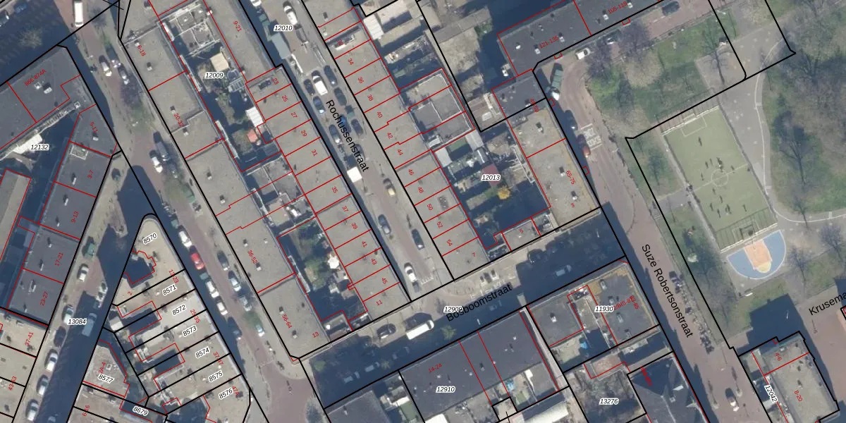 Het perceel waarop Rochussenstraat 50 staat heeft een oppervlakte van 2093 m². Dit is een zeer groot perceel. De perceeloppervlakte wordt geregistreerd door het Kadaster. Gedetailleerde informatie over de maten van dit perceel kunt u vinden in het rapport Kadastrale kaart met maatvoering van Rochussenstraat 50.