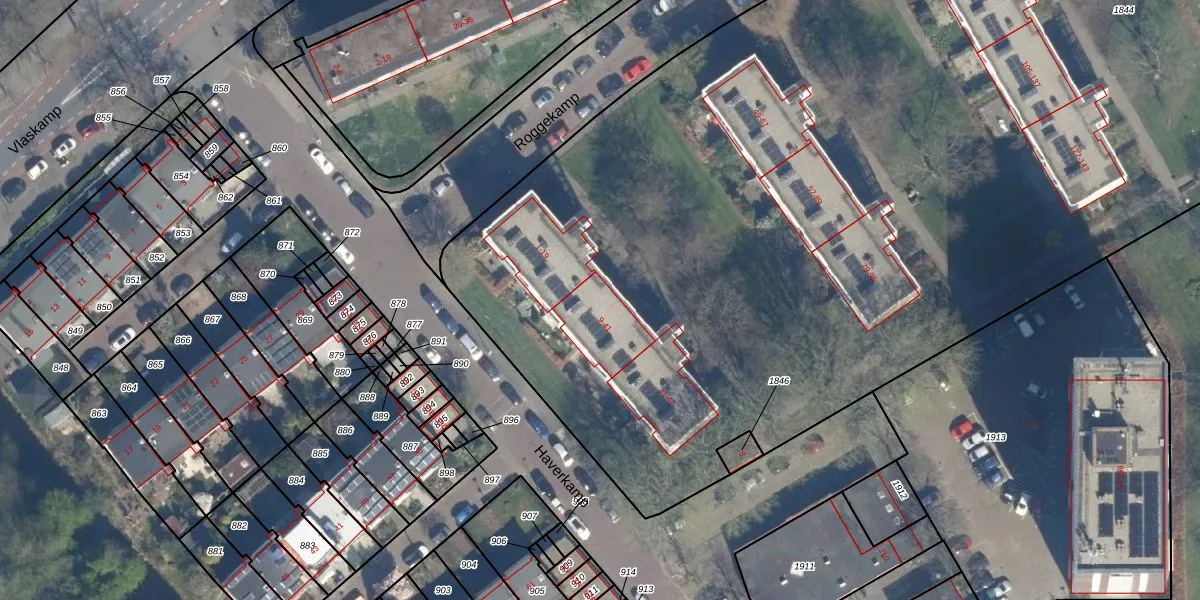 Het perceel waarop Roggekamp 9 staat heeft een oppervlakte van 1,2 ha. Dit is een zeer groot perceel. De perceeloppervlakte wordt geregistreerd door het Kadaster. Gedetailleerde informatie over de maten van dit perceel kunt u vinden in het rapport Kadastrale kaart met maatvoering van Roggekamp 9.