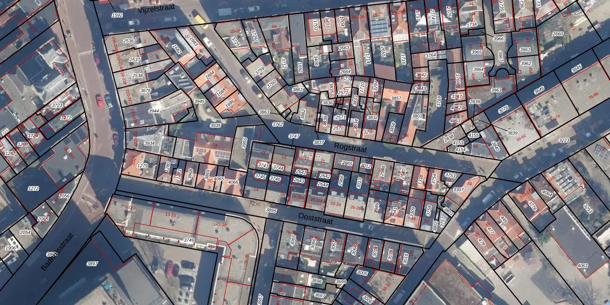 Het perceel waarop Rogstraat 15 staat heeft een oppervlakte van 62 m². Dit is een klein perceel. De perceeloppervlakte wordt geregistreerd door het Kadaster. Gedetailleerde informatie over de maten van dit perceel kunt u vinden in het rapport Kadastrale kaart met maatvoering van Rogstraat 15.