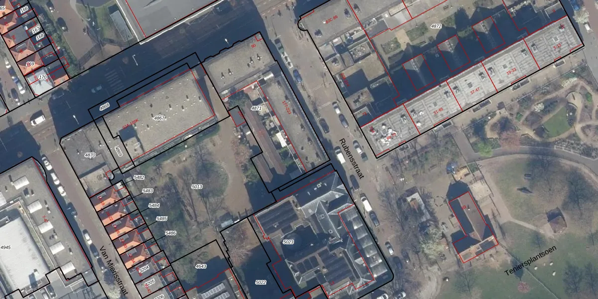Het perceel waarop Rubensstraat 201 staat heeft een oppervlakte van 1041 m². Dit is een zeer groot perceel. De perceeloppervlakte wordt geregistreerd door het Kadaster. Gedetailleerde informatie over de maten van dit perceel kunt u vinden in het rapport Kadastrale kaart met maatvoering van Rubensstraat 201.