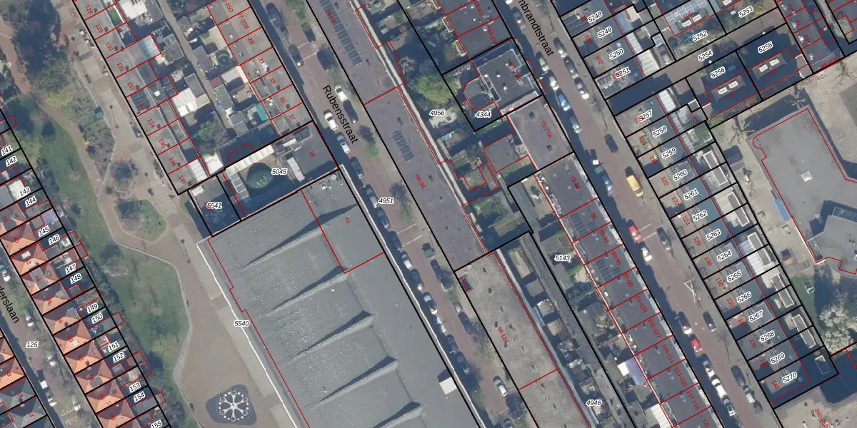 Het perceel waarop Rubensstraat 78 staat heeft een oppervlakte van 2001 m². Dit is een zeer groot perceel. De perceeloppervlakte wordt geregistreerd door het Kadaster. Gedetailleerde informatie over de maten van dit perceel kunt u vinden in het rapport Kadastrale kaart met maatvoering van Rubensstraat 78.