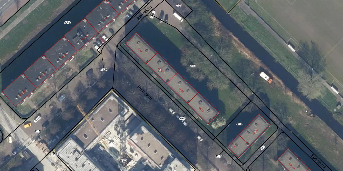 Het perceel waarop Ruimzicht 38 staat heeft een oppervlakte van 2322 m². Dit is een zeer groot perceel. De perceeloppervlakte wordt geregistreerd door het Kadaster. Gedetailleerde informatie over de maten van dit perceel kunt u vinden in het rapport Kadastrale kaart met maatvoering van Ruimzicht 38.