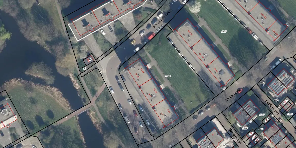 Het perceel waarop Saffierhorst 40 staat heeft een oppervlakte van 2579 m². Dit is een zeer groot perceel. De perceeloppervlakte wordt geregistreerd door het Kadaster. Gedetailleerde informatie over de maten van dit perceel kunt u vinden in het rapport Kadastrale kaart met maatvoering van Saffierhorst 40.