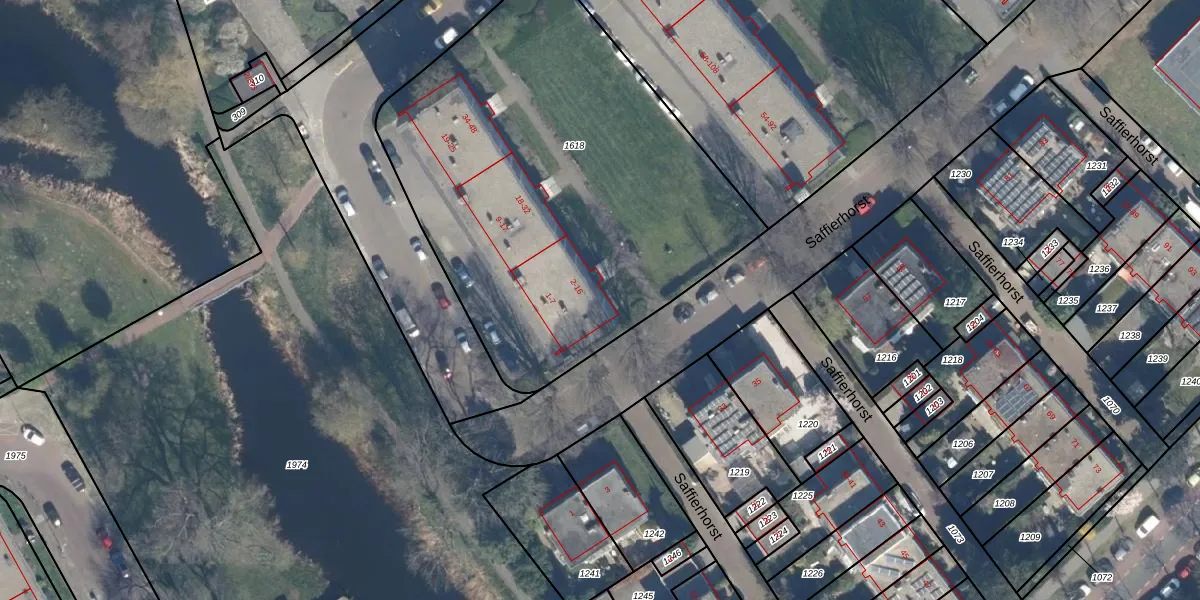 Het perceel waarop Saffierhorst 8 staat heeft een oppervlakte van 2579 m². Dit is een zeer groot perceel. De perceeloppervlakte wordt geregistreerd door het Kadaster. Gedetailleerde informatie over de maten van dit perceel kunt u vinden in het rapport Kadastrale kaart met maatvoering van Saffierhorst 8.
