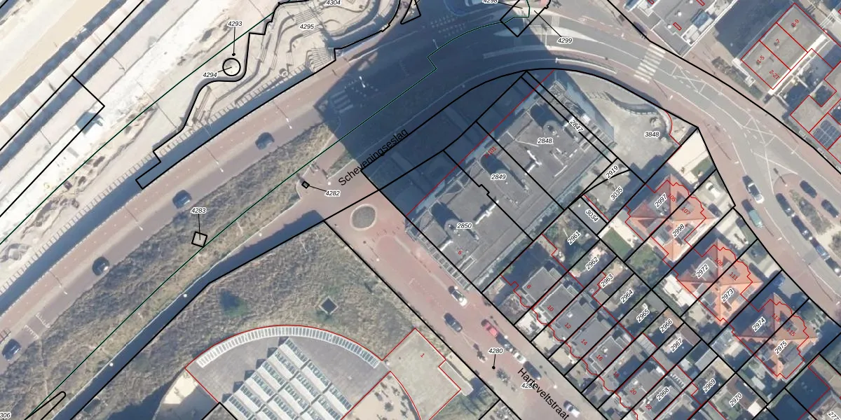 Scheveningseslag 19 is gelegen op kadastraal perceel GVH23AF2850. Deze kadastrale aanduiding is uniek en wordt gebruikt door het Kadaster om eigendomsrechten en andere zakelijke rechten vast te leggen. Het perceel maakt onderdeel uit van de kadastrale gemeente 's-Gravenhage.