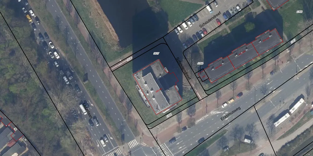 Het perceel waarop Schoutendreef 325 staat heeft een oppervlakte van 1566 m². Dit is een zeer groot perceel. De perceeloppervlakte wordt geregistreerd door het Kadaster. Gedetailleerde informatie over de maten van dit perceel kunt u vinden in het rapport Kadastrale kaart met maatvoering van Schoutendreef 325.