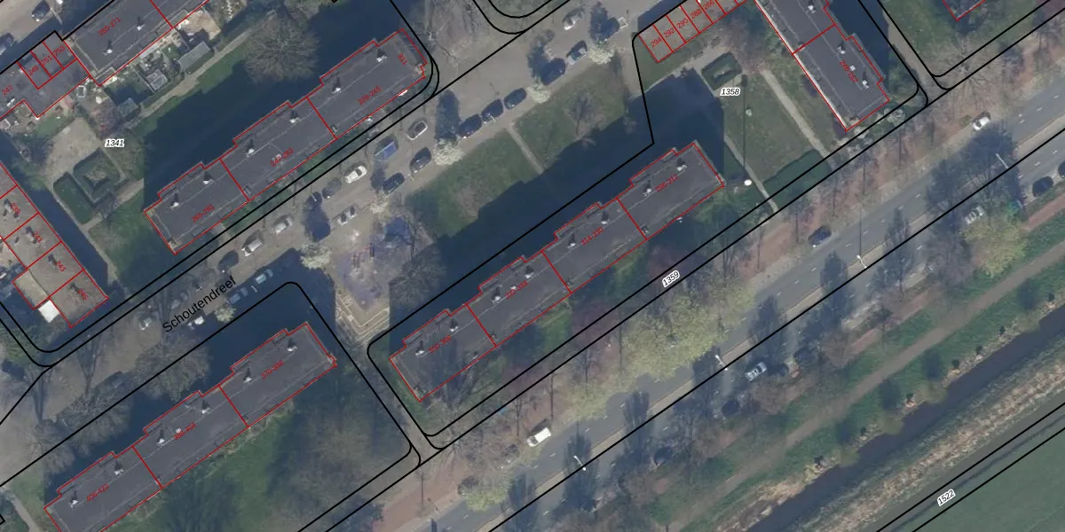 Schoutendreef 332 is gelegen op kadastraal perceel GVH37AW1358. Deze kadastrale aanduiding is uniek en wordt gebruikt door het Kadaster om eigendomsrechten en andere zakelijke rechten vast te leggen. Het perceel maakt onderdeel uit van de kadastrale gemeente 's-Gravenhage.
