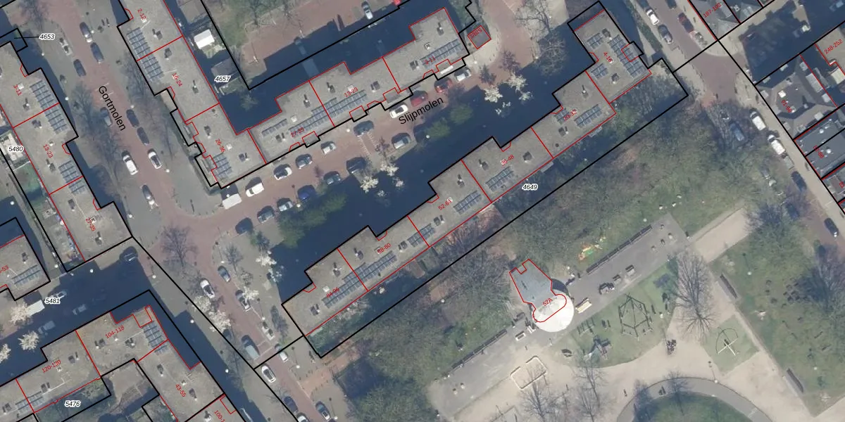 Het perceel waarop Slijpmolen 64 staat heeft een oppervlakte van 1963 m². Dit is een zeer groot perceel. De perceeloppervlakte wordt geregistreerd door het Kadaster. Gedetailleerde informatie over de maten van dit perceel kunt u vinden in het rapport Kadastrale kaart met maatvoering van Slijpmolen 64.