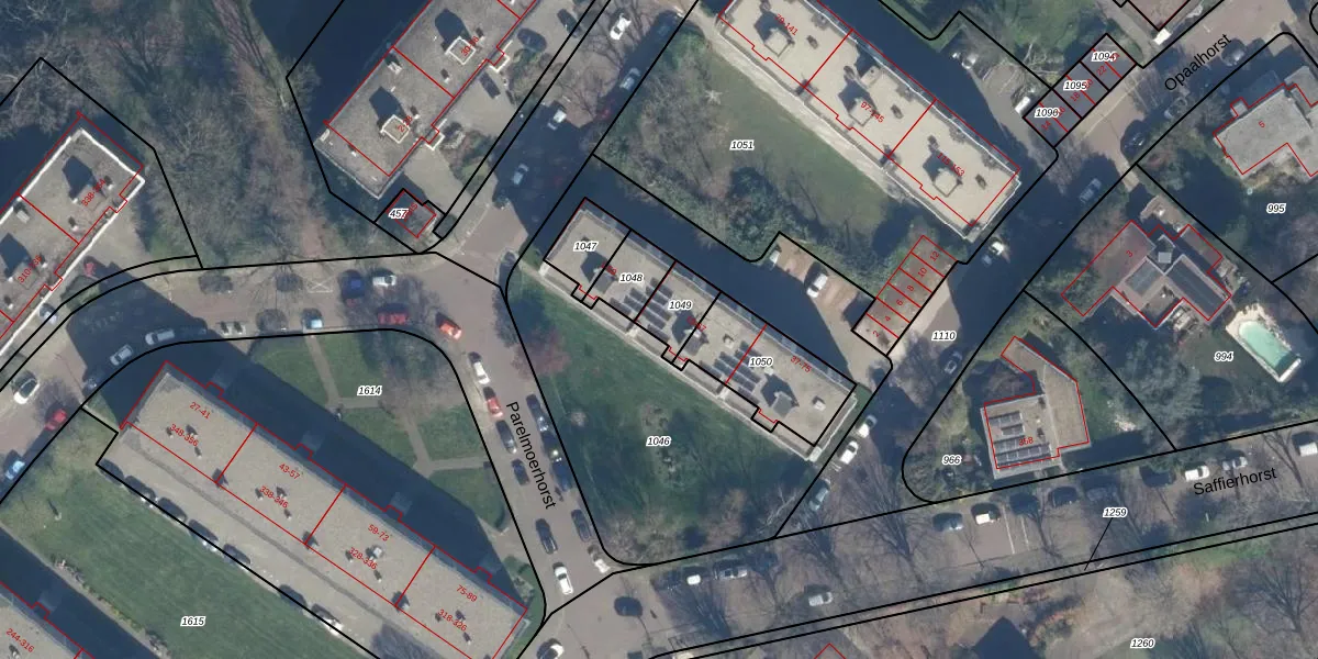 Het perceel waarop Smaragdhorst 25 staat heeft een oppervlakte van 98 m². Dit is een klein perceel. De perceeloppervlakte wordt geregistreerd door het Kadaster. Gedetailleerde informatie over de maten van dit perceel kunt u vinden in het rapport Kadastrale kaart met maatvoering van Smaragdhorst 25.