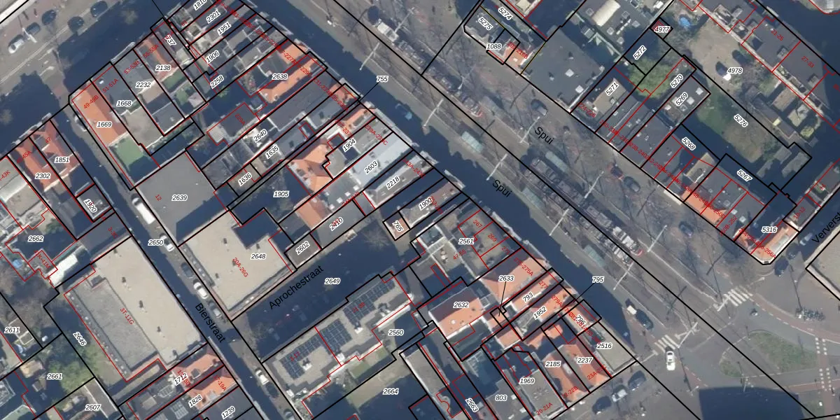 Het perceel waarop Spui 255 staat heeft een oppervlakte van 68 m². Dit is een klein perceel. De perceeloppervlakte wordt geregistreerd door het Kadaster. Gedetailleerde informatie over de maten van dit perceel kunt u vinden in het rapport Kadastrale kaart met maatvoering van Spui 255.