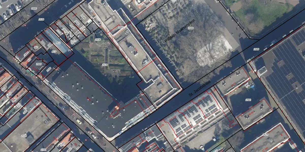 Het perceel waarop St. Jacobstraat 38 staat heeft een oppervlakte van 2990 m². Dit is een zeer groot perceel. De perceeloppervlakte wordt geregistreerd door het Kadaster. Gedetailleerde informatie over de maten van dit perceel kunt u vinden in het rapport Kadastrale kaart met maatvoering van St. Jacobstraat 38.