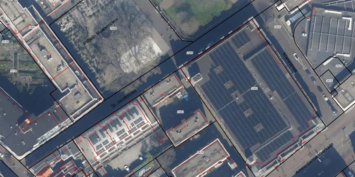 St. Jacobstraat 53 is gelegen op kadastraal perceel GVH05H2582. Deze kadastrale aanduiding is uniek en wordt gebruikt door het Kadaster om eigendomsrechten en andere zakelijke rechten vast te leggen. Het perceel maakt onderdeel uit van de kadastrale gemeente 's-Gravenhage.