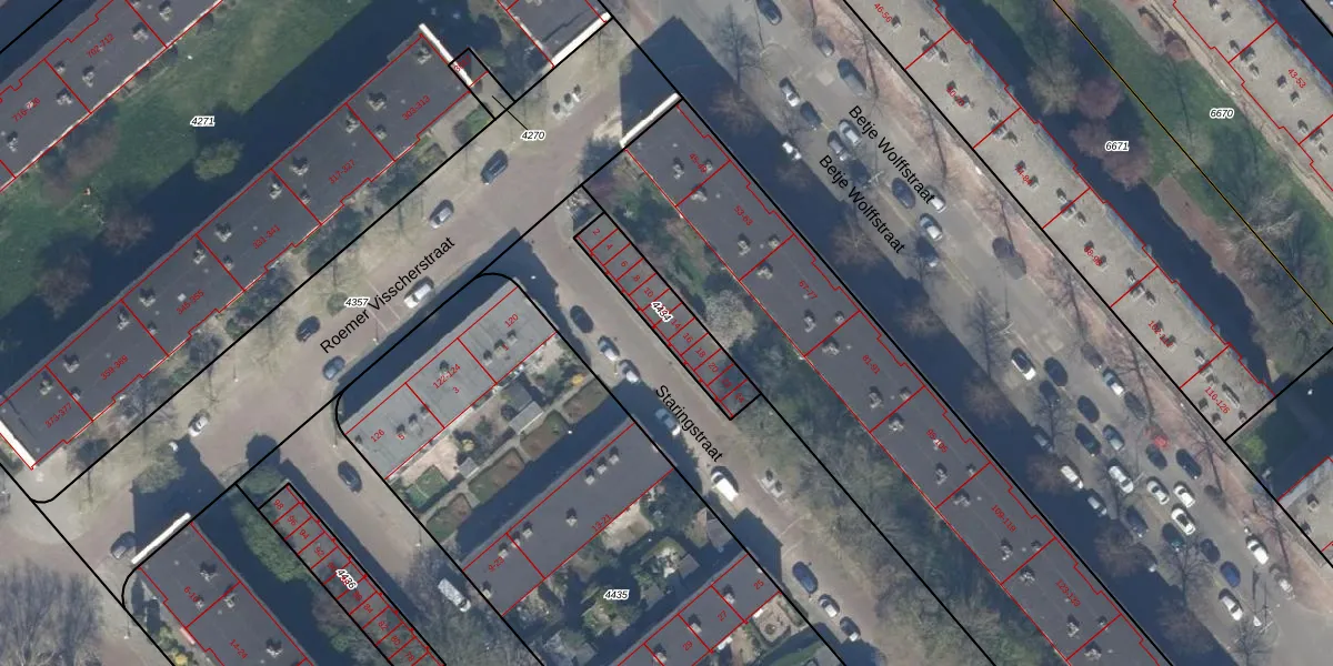 Staringstraat 14 is gelegen op kadastraal perceel GVH28AL4434. Deze kadastrale aanduiding is uniek en wordt gebruikt door het Kadaster om eigendomsrechten en andere zakelijke rechten vast te leggen. Het perceel maakt onderdeel uit van de kadastrale gemeente 's-Gravenhage.