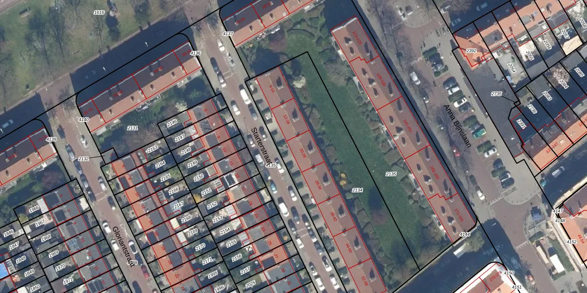 Het perceel waarop Starterstraat 22 staat heeft een oppervlakte van 2127 m². Dit is een zeer groot perceel. De perceeloppervlakte wordt geregistreerd door het Kadaster. Gedetailleerde informatie over de maten van dit perceel kunt u vinden in het rapport Kadastrale kaart met maatvoering van Starterstraat 22.
