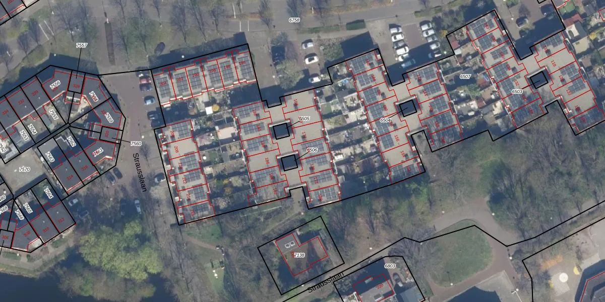Het perceel waarop Strausslaan 174 staat heeft een oppervlakte van 6421 m². Dit is een zeer groot perceel. De perceeloppervlakte wordt geregistreerd door het Kadaster. Gedetailleerde informatie over de maten van dit perceel kunt u vinden in het rapport Kadastrale kaart met maatvoering van Strausslaan 174.