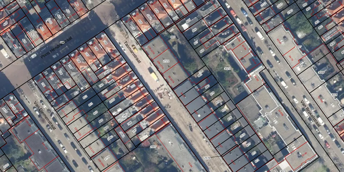 Het perceel waarop Tasmanstraat 99 staat heeft een oppervlakte van 728 m². Dit is een groot perceel. De perceeloppervlakte wordt geregistreerd door het Kadaster. Gedetailleerde informatie over de maten van dit perceel kunt u vinden in het rapport Kadastrale kaart met maatvoering van Tasmanstraat 99.