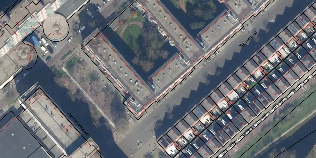 Het perceel waarop Thijssestraat 441 staat heeft een oppervlakte van 1,1 ha. Dit is een zeer groot perceel. De perceeloppervlakte wordt geregistreerd door het Kadaster. Gedetailleerde informatie over de maten van dit perceel kunt u vinden in het rapport Kadastrale kaart met maatvoering van Thijssestraat 441.