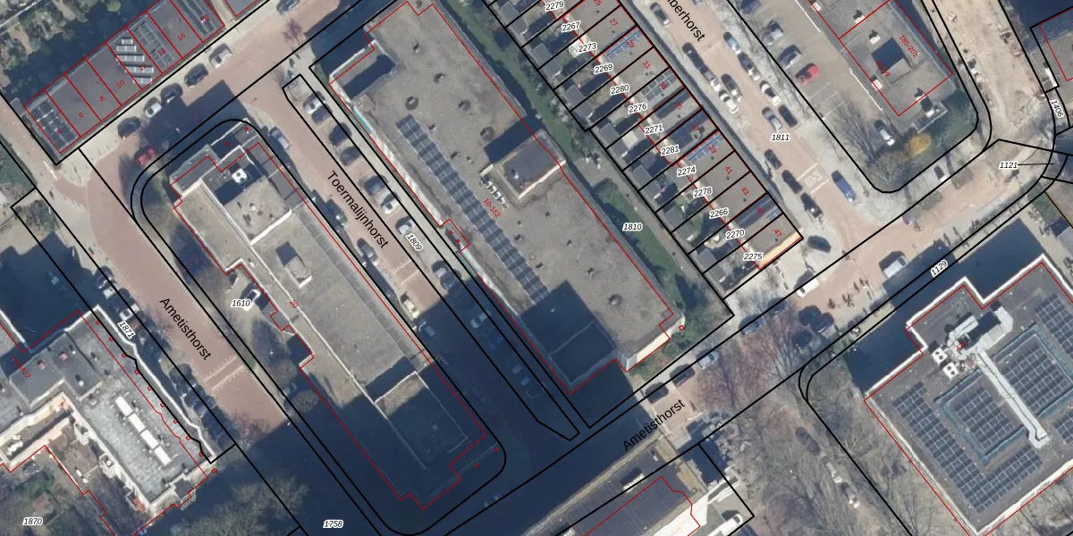 Het perceel waarop Toermalijnhorst 102 staat heeft een oppervlakte van 2863 m². Dit is een zeer groot perceel. De perceeloppervlakte wordt geregistreerd door het Kadaster. Gedetailleerde informatie over de maten van dit perceel kunt u vinden in het rapport Kadastrale kaart met maatvoering van Toermalijnhorst 102.