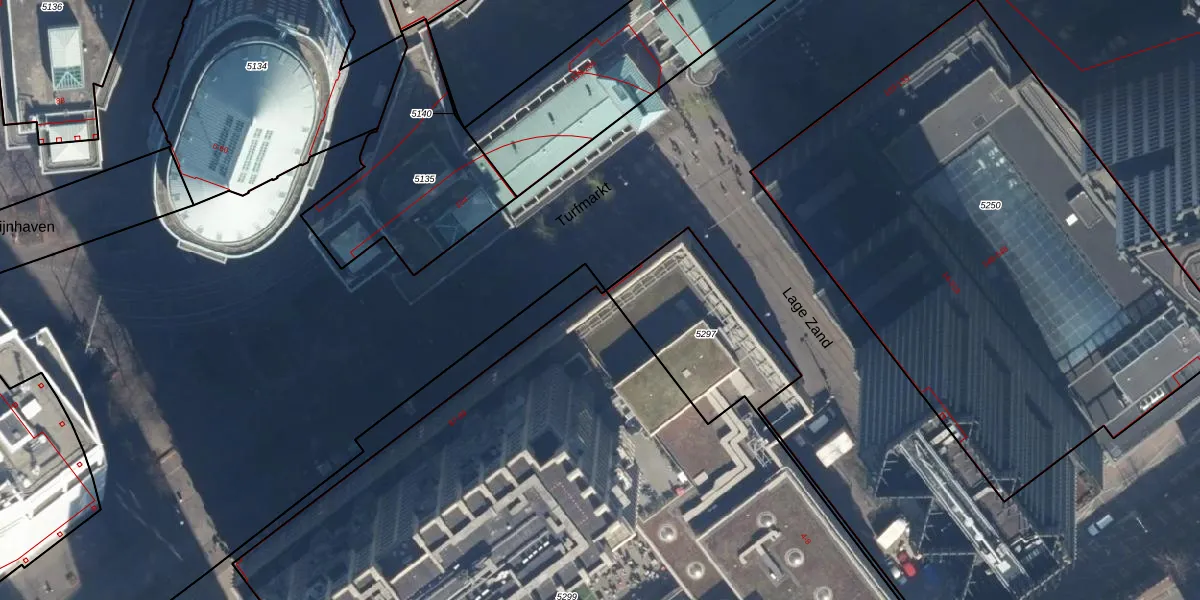Het perceel waarop Turfmarkt 99 staat heeft een oppervlakte van 6125 m². Dit is een zeer groot perceel. De perceeloppervlakte wordt geregistreerd door het Kadaster. Gedetailleerde informatie over de maten van dit perceel kunt u vinden in het rapport Kadastrale kaart met maatvoering van Turfmarkt 99.