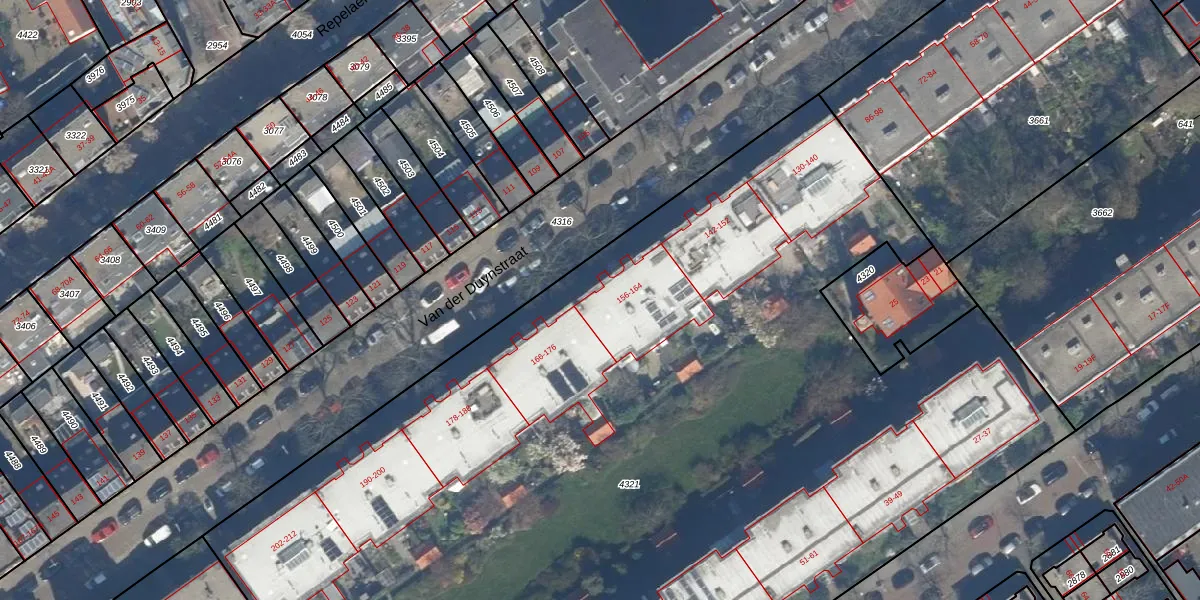 Van der Duynstraat 164 is gelegen op kadastraal perceel GVH21AD4321. Deze kadastrale aanduiding is uniek en wordt gebruikt door het Kadaster om eigendomsrechten en andere zakelijke rechten vast te leggen. Het perceel maakt onderdeel uit van de kadastrale gemeente 's-Gravenhage.