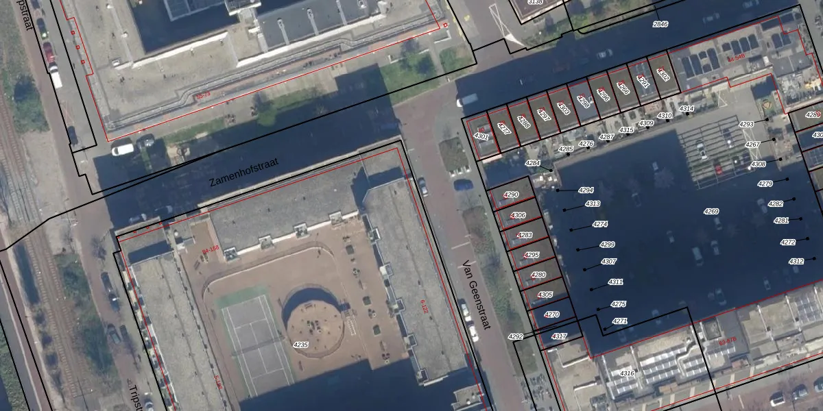 Het perceel waarop Van Geenstraat 58 staat heeft een oppervlakte van 6196 m². Dit is een zeer groot perceel. De perceeloppervlakte wordt geregistreerd door het Kadaster. Gedetailleerde informatie over de maten van dit perceel kunt u vinden in het rapport Kadastrale kaart met maatvoering van Van Geenstraat 58.
