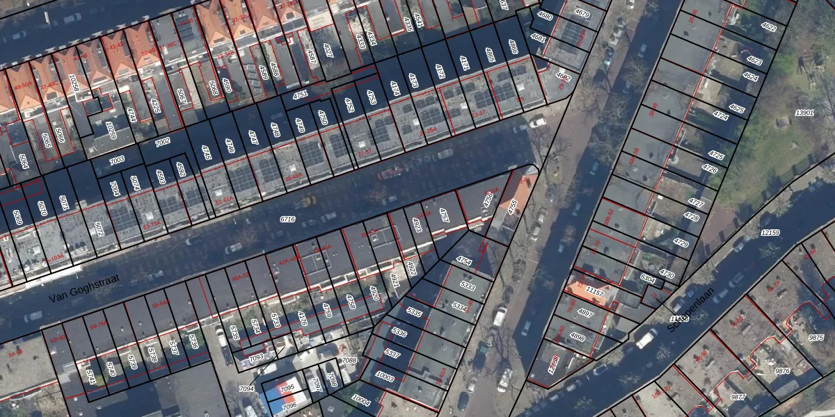 Het perceel waarop Van Goghstraat 18 staat heeft een oppervlakte van 65 m². Dit is een klein perceel. De perceeloppervlakte wordt geregistreerd door het Kadaster. Gedetailleerde informatie over de maten van dit perceel kunt u vinden in het rapport Kadastrale kaart met maatvoering van Van Goghstraat 18.