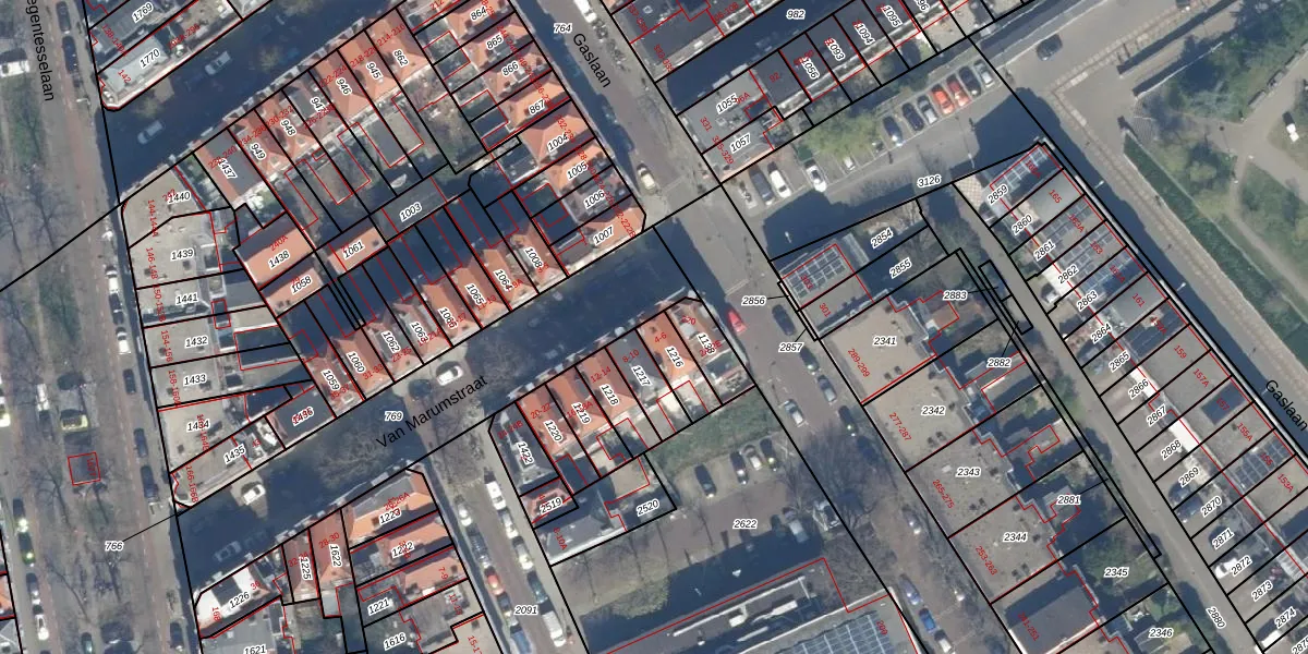 Het perceel waarop Van Marumstraat 6 staat heeft een oppervlakte van 91 m². Dit is een klein perceel. De perceeloppervlakte wordt geregistreerd door het Kadaster. Gedetailleerde informatie over de maten van dit perceel kunt u vinden in het rapport Kadastrale kaart met maatvoering van Van Marumstraat 6.