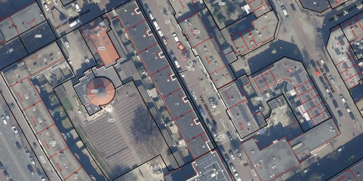 Het perceel waarop Van Mierisstraat 173 staat heeft een oppervlakte van 2141 m². Dit is een zeer groot perceel. De perceeloppervlakte wordt geregistreerd door het Kadaster. Gedetailleerde informatie over de maten van dit perceel kunt u vinden in het rapport Kadastrale kaart met maatvoering van Van Mierisstraat 173.