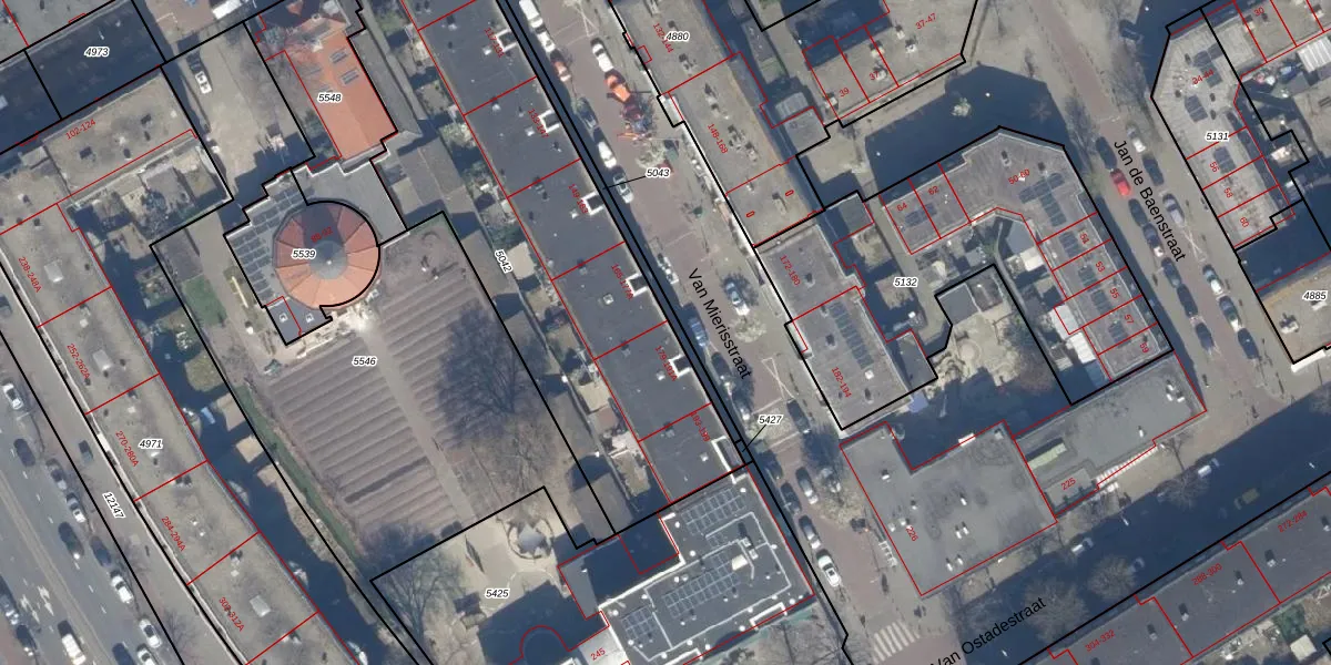Het perceel waarop Van Mierisstraat 179 staat heeft een oppervlakte van 2141 m². Dit is een zeer groot perceel. De perceeloppervlakte wordt geregistreerd door het Kadaster. Gedetailleerde informatie over de maten van dit perceel kunt u vinden in het rapport Kadastrale kaart met maatvoering van Van Mierisstraat 179.