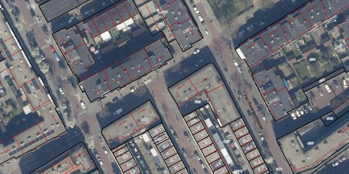 Van Ostadestraat 166 is gelegen op kadastraal perceel GVH22AE5321. Deze kadastrale aanduiding is uniek en wordt gebruikt door het Kadaster om eigendomsrechten en andere zakelijke rechten vast te leggen. Het perceel maakt onderdeel uit van de kadastrale gemeente 's-Gravenhage.