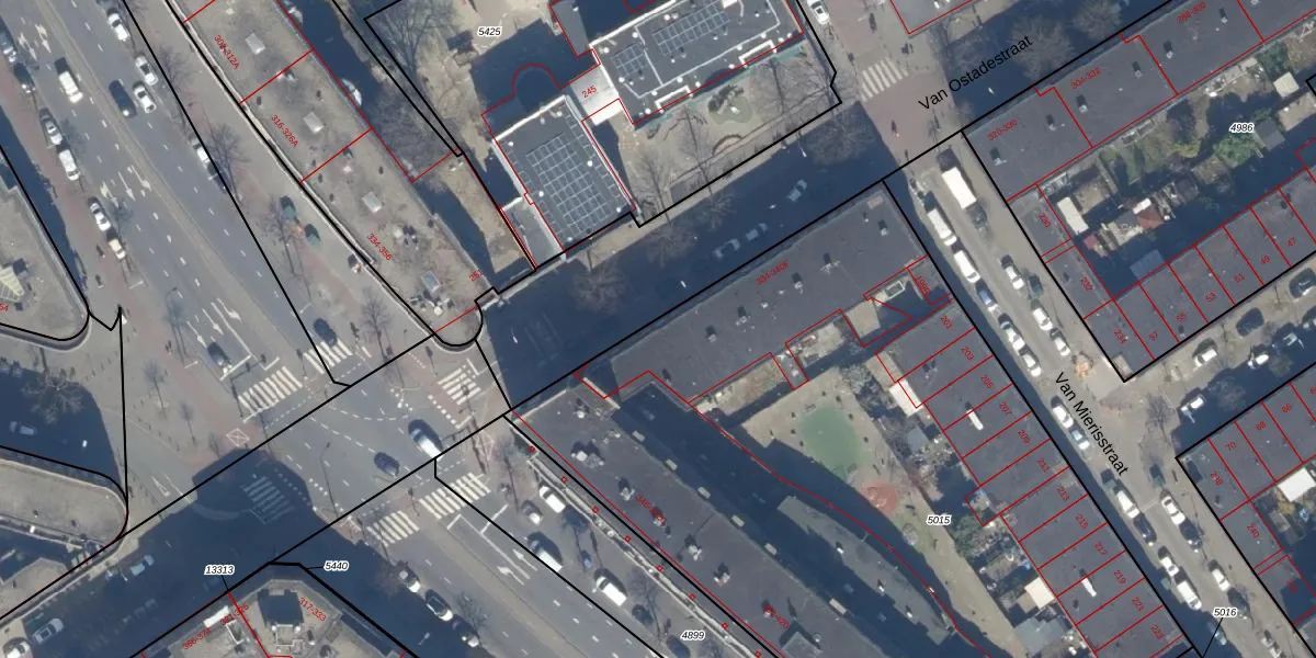 Van Ostadestraat 340-B is gelegen op kadastraal perceel GVH22AE5015. Deze kadastrale aanduiding is uniek en wordt gebruikt door het Kadaster om eigendomsrechten en andere zakelijke rechten vast te leggen. Het perceel maakt onderdeel uit van de kadastrale gemeente 's-Gravenhage.
