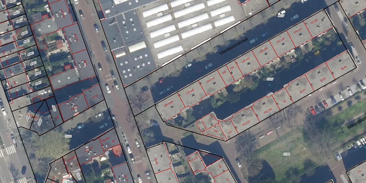 Vlierboomstraat 186 is gelegen op kadastraal perceel GVH29AM5187. Deze kadastrale aanduiding is uniek en wordt gebruikt door het Kadaster om eigendomsrechten en andere zakelijke rechten vast te leggen. Het perceel maakt onderdeel uit van de kadastrale gemeente 's-Gravenhage.