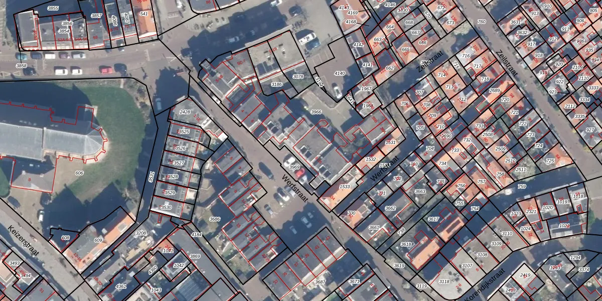 Het perceel waarop Werfstraat 16 staat heeft een oppervlakte van 1237 m². Dit is een zeer groot perceel. De perceeloppervlakte wordt geregistreerd door het Kadaster. Gedetailleerde informatie over de maten van dit perceel kunt u vinden in het rapport Kadastrale kaart met maatvoering van Werfstraat 16.