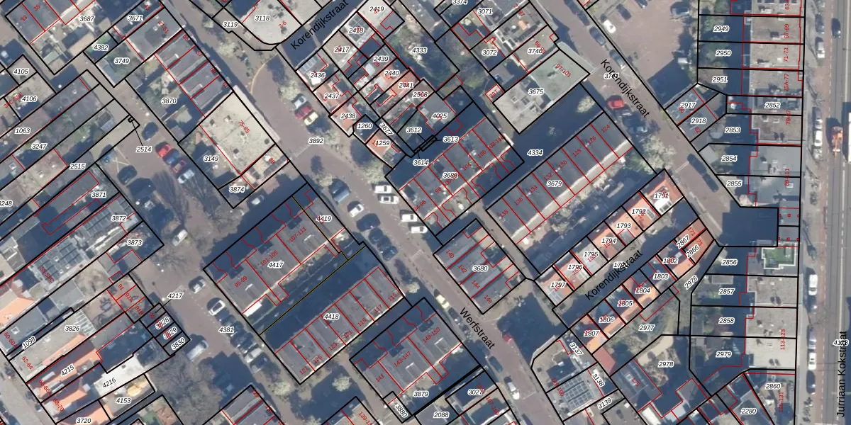 Het perceel waarop Werfstraat 94 staat heeft een oppervlakte van 491 m². Dit is een groot perceel. De perceeloppervlakte wordt geregistreerd door het Kadaster. Gedetailleerde informatie over de maten van dit perceel kunt u vinden in het rapport Kadastrale kaart met maatvoering van Werfstraat 94.