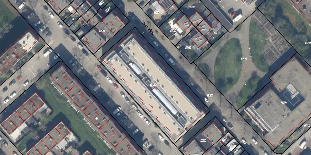 Het perceel waarop Werkzijde 111 staat heeft een oppervlakte van 2303 m². Dit is een zeer groot perceel. De perceeloppervlakte wordt geregistreerd door het Kadaster. Gedetailleerde informatie over de maten van dit perceel kunt u vinden in het rapport Kadastrale kaart met maatvoering van Werkzijde 111.