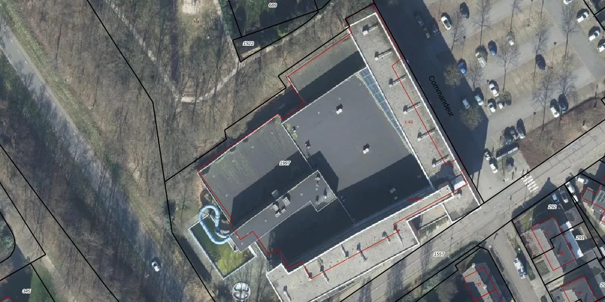 Het perceel waarop Commandeur 38 staat heeft een oppervlakte van 6510 m². Dit is een zeer groot perceel. De perceeloppervlakte wordt geregistreerd door het Kadaster. Gedetailleerde informatie over de maten van dit perceel kunt u vinden in het rapport Kadastrale kaart met maatvoering van Commandeur 38.
