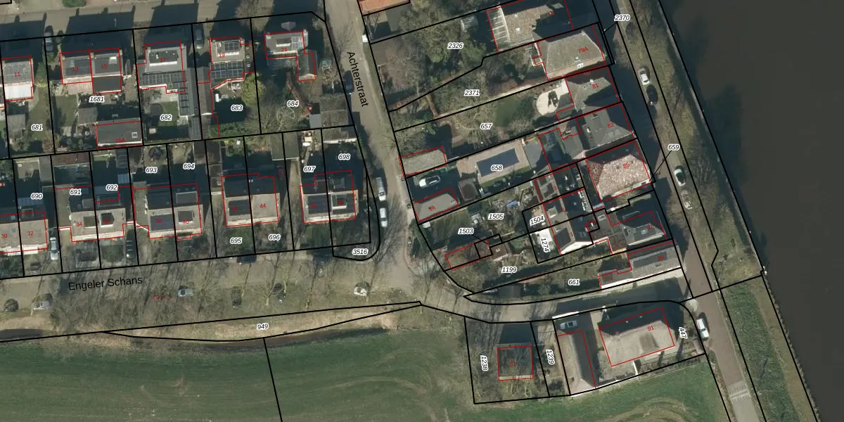 Het perceel waarop Achterstraat 3-A staat heeft een oppervlakte van 591 m². Dit is een groot perceel. De perceeloppervlakte wordt geregistreerd door het Kadaster. Gedetailleerde informatie over de maten van dit perceel kunt u vinden in het rapport Kadastrale kaart met maatvoering van Achterstraat 3-A.