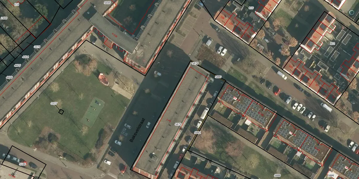 Baksvelstraat 15 is gelegen op kadastraal perceel HTG00K5879. Deze kadastrale aanduiding is uniek en wordt gebruikt door het Kadaster om eigendomsrechten en andere zakelijke rechten vast te leggen. Het perceel maakt onderdeel uit van de kadastrale gemeente 's-Hertogenbosch.