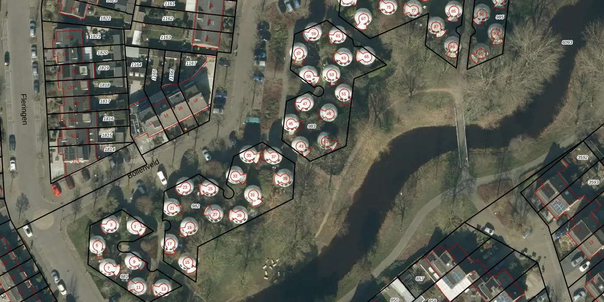 Het perceel waarop Bollenveld 43 staat heeft een oppervlakte van 869 m². Dit is een groot perceel. De perceeloppervlakte wordt geregistreerd door het Kadaster. Gedetailleerde informatie over de maten van dit perceel kunt u vinden in het rapport Kadastrale kaart met maatvoering van Bollenveld 43.