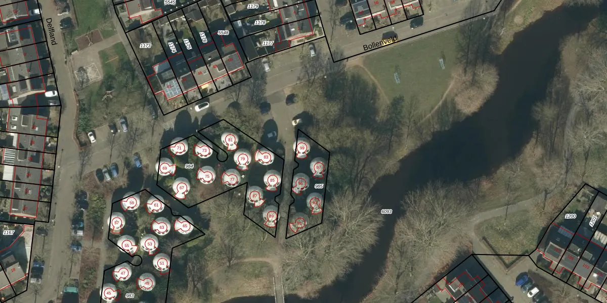 Het perceel waarop Bollenveld 99 staat heeft een oppervlakte van 329 m². Dit is een groot perceel. De perceeloppervlakte wordt geregistreerd door het Kadaster. Gedetailleerde informatie over de maten van dit perceel kunt u vinden in het rapport Kadastrale kaart met maatvoering van Bollenveld 99.