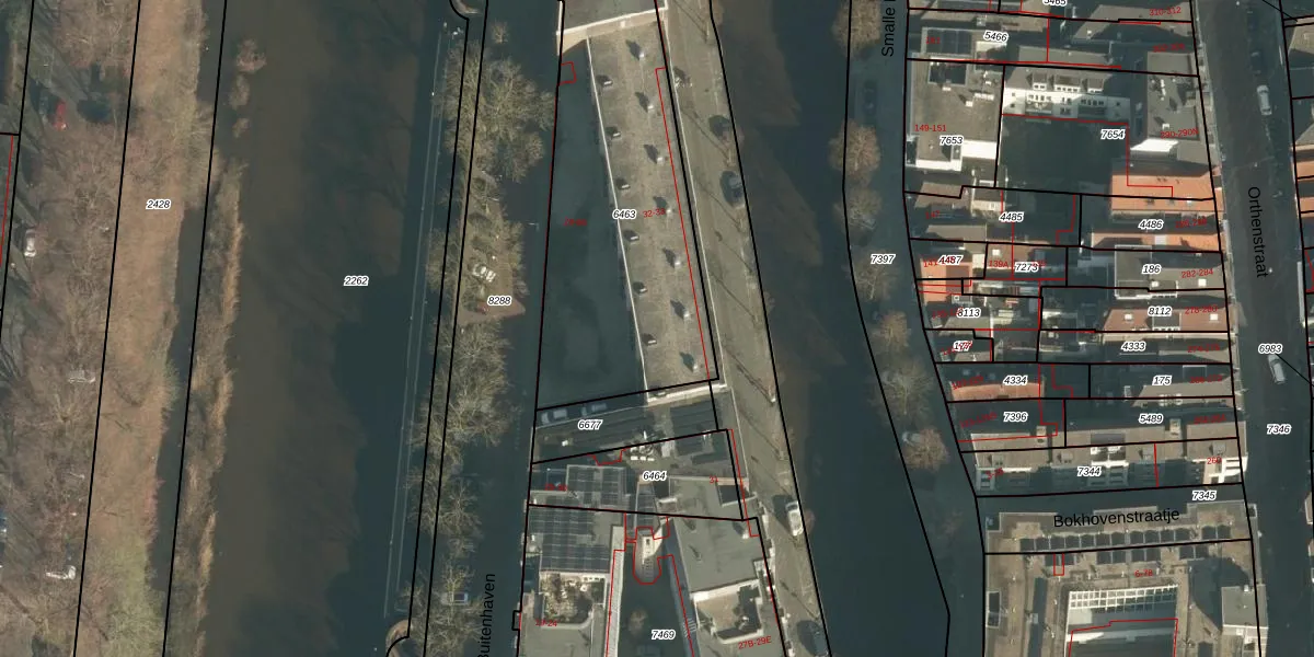 Het perceel waarop Buitenhaven 66 staat heeft een oppervlakte van 1263 m². Dit is een zeer groot perceel. De perceeloppervlakte wordt geregistreerd door het Kadaster. Gedetailleerde informatie over de maten van dit perceel kunt u vinden in het rapport Kadastrale kaart met maatvoering van Buitenhaven 66.